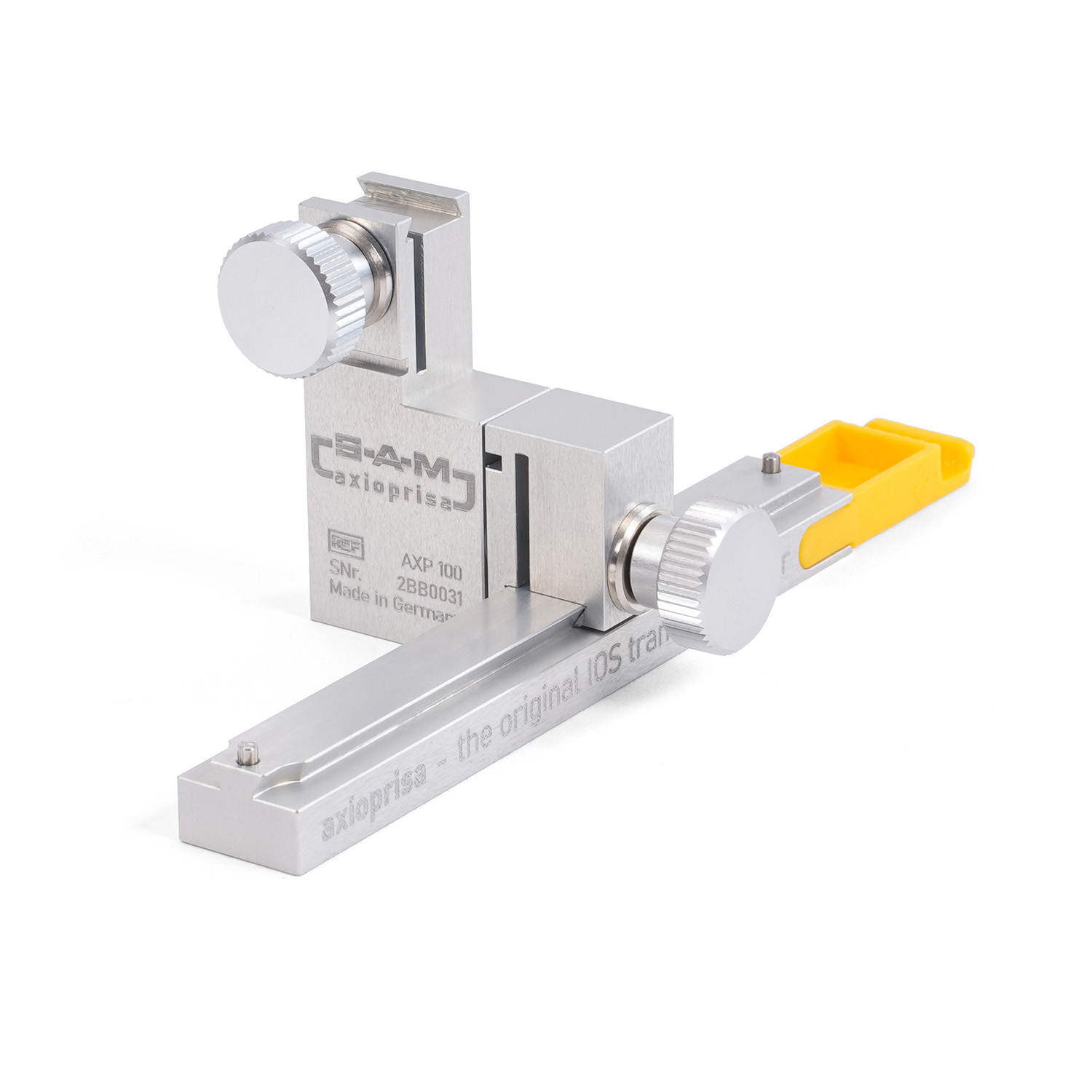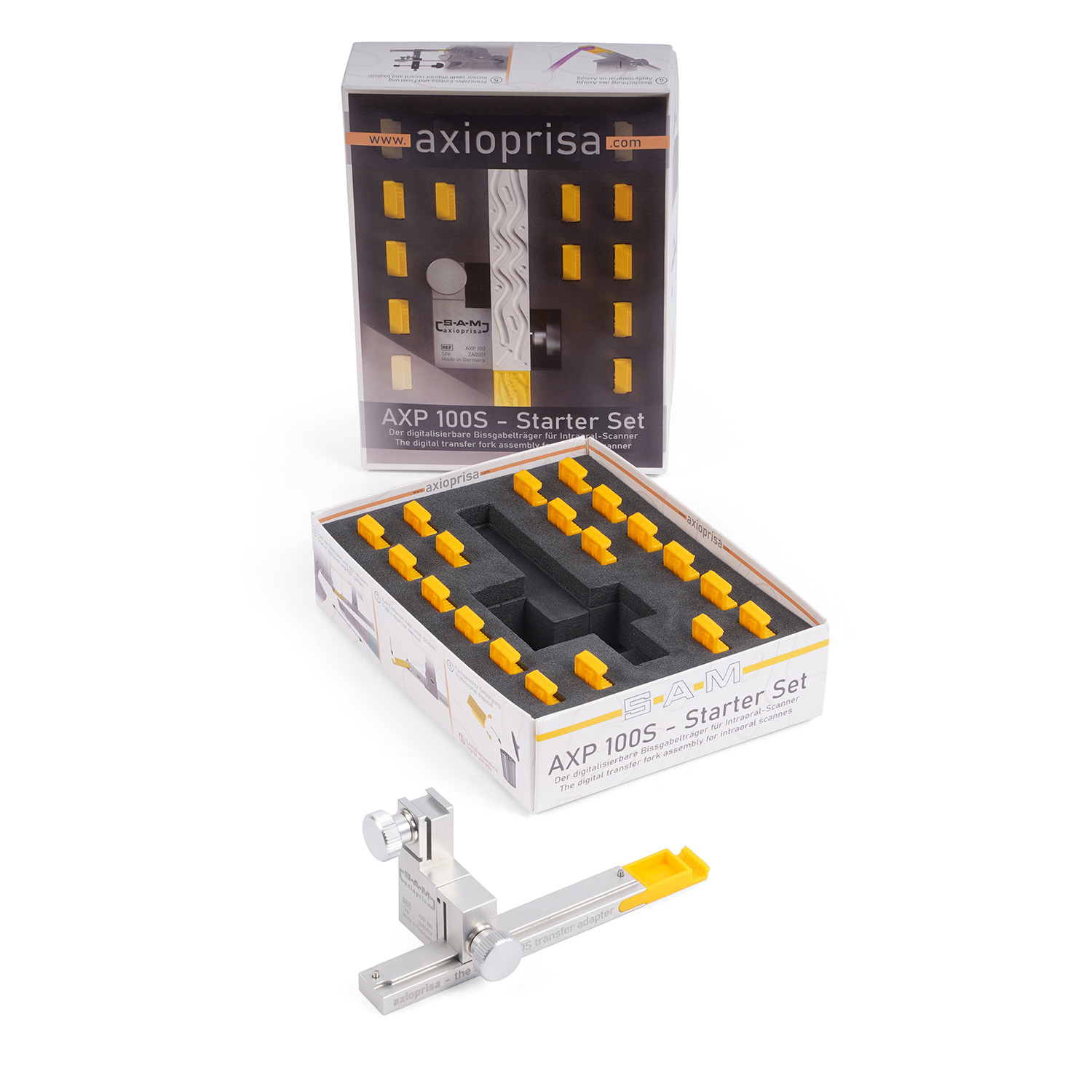Сборка переноса Axioprisa прикреплена к переносной дуге SAM обычным способом. Благодаря комбинации Axioprisa и переносной дуги можно сканировать верхнюю челюсть в правильном анатомическом положении. Франкфуртская горизонталь — это плоскость, используемая всеми артикуляторами SAM. Используя этот путь, можно переносить положение челюсти с дополнительным сканированием во время внутриротового сканирования. Путь к простым процессам в стоматологической практике позволяет свести источники ошибок к минимуму.