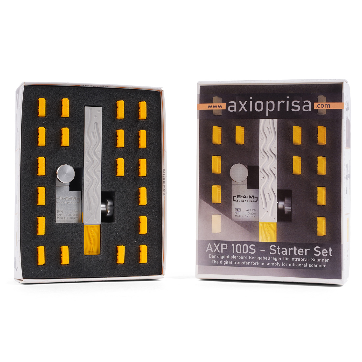 Одноразовые Axiojigs делают дезинфекцию лёгкой и простой. Жёлтые пластиковые Axiojigs безопасны для тела и контролируются в соответствии со стандартами ЕС и FDA. Axiojigs являются связующим звеном между пациентом и переносной дугой и фиксируются на верхней челюсти с помощью небольшого кусочка материала для регистрации прикуса. Это обеспечивает идеальную посадку на резцовых зубах во время процесса сканирования.