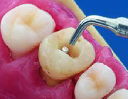 Рабочая часть насадки расположена на её кончике, это последние 2 – 3 мм. Кончик насадки (рабочую часть насадки), следует располагать соосно продольной оси зуба. Насадкой, не погружая её сразу в десневую борозду, необходимо пройти по периметру зуба, убирая доступные для обзора наддесневые (или поддесневые) отложения, без чрезмерного латерального давления. Начинайте работу с лицевой стороны зуба перемещаясь к мезиальному или дистальному краю.